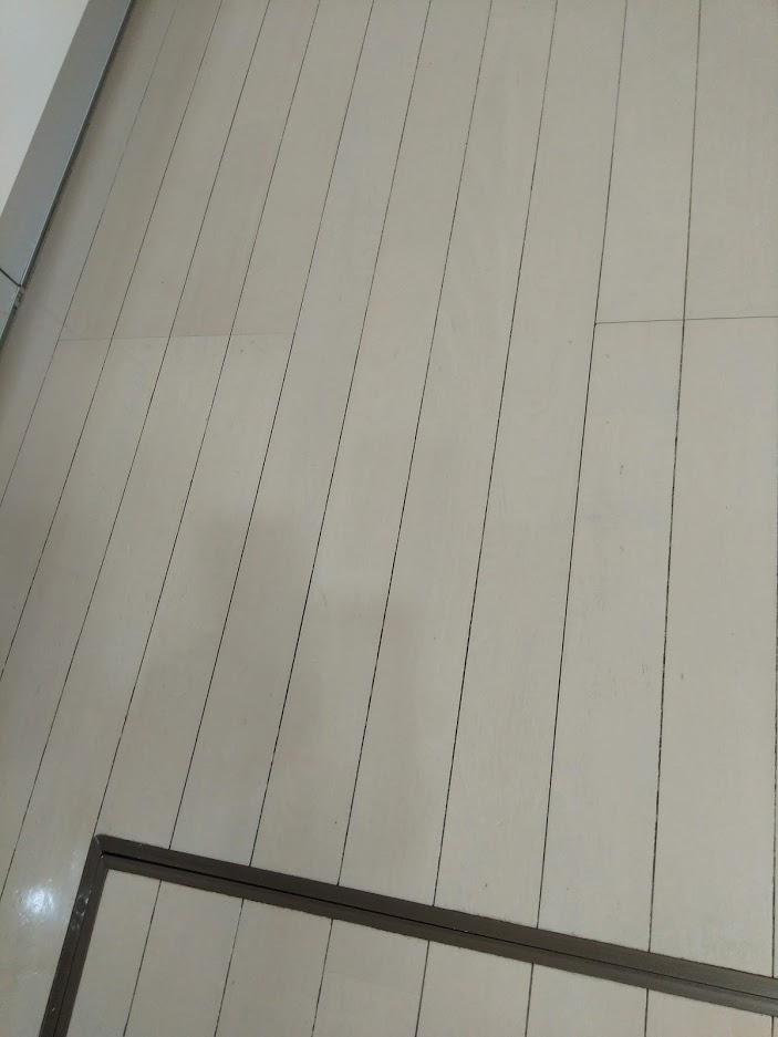 ホワイト系の床はキズや陥没はそんなに目立たないのですが、汚れは目立ちやすくて飲み物をこぼしたり薬品(たとえばマニュキュア落としなど)をこぼしただけでもワックスが取れてしまったりベタベタになって結局汚れの原因になってしまったりします。こういう場合は市販しているワックスを塗ってもなかなかきれいに仕上がってくれません。
